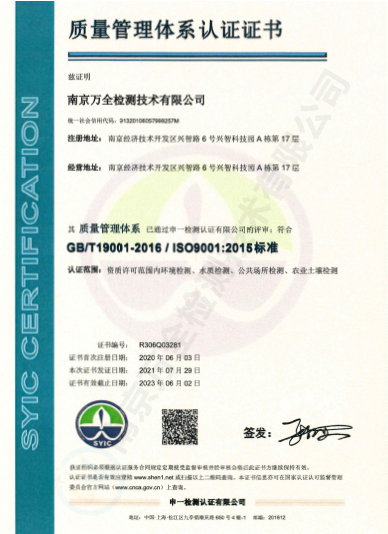 南京萬(wàn)全檢測(cè)技術(shù)有限公司,籌建于2013年1月,注冊(cè)資金500萬(wàn),公司坐落于南京經(jīng)濟(jì)技術(shù)開(kāi)發(fā)區(qū)興智路6號(hào)興智科技園A棟17層,實(shí)驗(yàn)室占地面積1750余平米。公司是一家獲得省級(jí)CMA計(jì)量認(rèn)證資質(zhì)、具有獨(dú)立法人、政府認(rèn)可的綜合性、專業(yè)性的檢測(cè)機(jī)構(gòu)。環(huán)境監(jiān)測(cè)業(yè)務(wù)是其重要的檢測(cè)業(yè)務(wù)之一,目前已獲得省級(jí)計(jì)量資格認(rèn)可項(xiàng)目314項(xiàng),設(shè)備齊全,具有較強(qiáng)的技術(shù)能力。